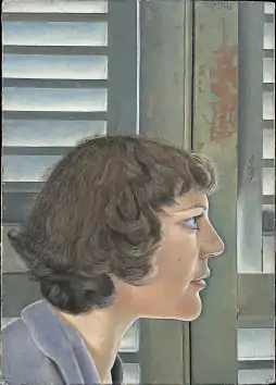 Utilising a prominent profile arrangement for the portrait, Freud depicts Garman in cool tones against a bare background of green shutters with areas of peeling paint. Typical of his early portraiture style, Freud paints Garman's hair and the subtle changes in the background with great attention to detail.[10] According to art historian Sheila McGregor,[7] the inclusion of aesthetically imperfect background elements "reveals his intention to depict the world with all its imperfections, bereft of symbolism or flattery."[10]