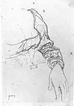 His signature is written in the business tucked into the edge of the mirror.[2] A number of small paper studies survive; the earliest of which show her reclining erotically on a sofa, the later sketches focus on the presentation of her upper body and chest.[5] Some art historians have compared it in tone to his Grande Odalisque, which he was working on simultaneously.[3]