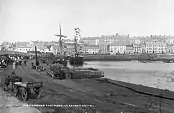 The site of Portrush, with its excellent natural defences, probably became a permanent settlement around the 12th or 13th century. A church is known to have existed on Ramore Head at this time, but no part of it now survives. From the records of the papal taxation of 1306, the Portrush church – and by extension the village – appears to have been reasonably wealthy. The promontory also held two castles, at varying periods. The first of these, Caisleán an Teenie, is believed to have been at the tip of Ramore Head, and probably destroyed in the late 16th century; the other, Portrush Castle, may have been built around the time of the Plantation of Ulster in the early 17th century. Nothing survives of either castle.[8]