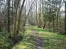 ![]() A footpath through Potton Wood, showing young coppiced trees with bare branches | |