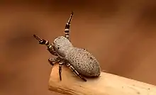 Characteristic mark of the species. Adult male and females, as well as all but the earliest instar juveniles, have heavy black brushing on their front legs