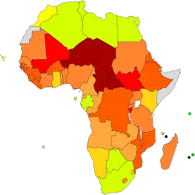 Poverty in Africa is the lack of provision to satisfy the basic human needs of certain people in Africa. African nations typically fall toward the bottom of any list measuring small size economic activity, such as income per capita or GDP per capita, despite a wealth of natural resources. In 2009, 22 of 24 nations identified as having "Low Human Development" on the United Nations' (UN) Human Development Index were in Sub-Saharan Africa.[1] In 2006, 34 of the 50 nations on the UN list of least developed countries were in Africa.[2] In many nations, GDP per capita is less than US$5200 per year, with the vast majority of the population living on much less (according to World Bank data, by 2016 the island nation of Seychelles was the only African country with a GDP per capita above US$10,000 per year[3]). In addition, Africa's share of income has been consistently dropping over the past century by any measure. In 1820, the average European worker earned about three times what the average African did. Now, the average European earns twenty times what the average African does.[4] Although GDP per capita incomes in Africa have also been steadily growing, measures are still far better in other parts of the world.