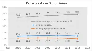 26 percent of Korean elderly lived in poverty in 2008.[10] Among OECD countries, the poverty risk is significantly higher for South Korea's elderly. While the number of elders living in poverty increases every year for many countries, South Korea remains with the highest poverty rate of people aged over 65 among the OECD countries.[11] Moreover, the poverty risk is particularly high for the South Korean elderly who are less educated, living alone, living in a rural area, or are not in good health. Many low-income elderly individuals are currently living with their children, which are often providing them with financial aid, and many also depend on welfare transfers.[11]