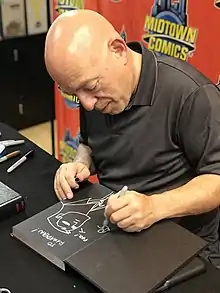 Brian Michael Bendis, Michael Avon Oeming and David W. Mack became friends while all three were working on individual small press projects. Bendis says that he also began to "analyz[e] why it was that I [had] never attempted to write a superhero comic" at the time, while he was writing crime books such as Jinx and Goldfish, despite his love of the genre. Concluding that Frank Miller's The Dark Knight Returns and Alan Moore and Dave Gibbons' Watchmen had sufficiently explored the genre, Bendis decided to work in other genres.[1] The series' concept was derived from his love of crime fiction and police procedurals in general, as well as specific works such as Homicide: A Year on the Killing Streets,[1][2] Janis Joplin's biography,[1] Taxi Driver, T-Men, Traffic[2] and Visions Of Light: The Art of Cinematography,[3] and would take the form of a Behind the Music-type look at superheroes.[1] Powers, Oeming says, is "a superhero universe seen through the eyes of the police... [as] observed by the media" and everyday individuals. Bendis' intention was to view the "cliches of the superhero genre through the harder eyes of the cops", but with the added layer that (echoing "Behind the Music") "every arc has some footing in a famous rock star story". Bendis' scripts are often compiled from "a list of scenes", eschewing "the big exploding ending" in favor of a "character-driven or psychological ending". Indeed, in experimenting with plots, the duo swiftly moved beyond 'mere' police procedurals (despite those being both creators' "favorite stories"), constantly pushing each other creatively in new ways. In conceiving plots for the series, Bendis emphasizes the purpose and themes in the narrative over "just being cool", and allowing the theme to dictate the direction of the story.[4]