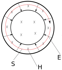The center conductor is held at voltage V and draws a current I toward the right, so we expect a total power flow of P = V·I according to basic laws of electricity. By evaluating the Poynting vector, however, we are able to identify the profile of power flow in terms of the electric and magnetic fields inside the coax. The electric fields are of course zero inside of each conductor, but in between the conductors () symmetry dictates that they are strictly in the radial direction and it can be shown (using Gauss's law) that they must obey the following form: