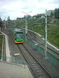 Poznański Fast Tram (Polish: Poznański Szybki Tramwaj, PST, informally: PeSTka, pestka – drupe, stone fruit) is a 8.1-kilometre (5.0 mi) stretch of grade-separated tram/light rail line in Poznań, Poland. The tracks are set in a cutting or on an overpass, switches allowing to drive on adjacent tracks. The stops, resembling railroad stations, have a different colour scheme each. This tram line was created as an alternative to a more expensive metro. The PST, opened in 1997, links the densely populated northern districts of Winogrady and Piątkowo with the city centre. It is served by lines 12, 14, 15 and 16, as well as by the night line N201.