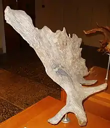 Named by William Boyd Dawkins in 1872 on the basis of a partial antler from the Cromer Forest Bed. Croitor suggests that Cervus belgrandi is a junior synonym.[7] Known from late Early Pleistocene to Middle Pleistocene localities in England, Spain,[10] France,[11] Germany[12] and Italy.[13]