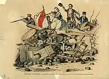 The Mass was attended by the patriotic retired priest Jan Arnold (1785–1872),[1] the brother of the radical democrat Emanuel Arnold. After the Mass, the participants did not disperse and marched through the city in a procession. Around noon, they were stopped by the army in Celetná Street. This ignited a spark of rebellion led by students and radical Democrats (the Liberals stayed away and sought a compromise with Windischgrätz). Many barricades were erected in Prague, where the 12th – 14th century was fought. On the very first day of the uprising, June 12, a stray bullet probably killed Prince Windischgrätz's wife as she stood at a window watching street fights.[2] The students fortified themselves in Karolinum and Klementinum and managed to capture Lev Thun, who came from Malá Strana to see what was happening. The next day, Thun refused to mediate negotiations with the students with Windischgrätz. Thun was eventually released at the urging of Palacký, Šafárik and Borovský.[3]