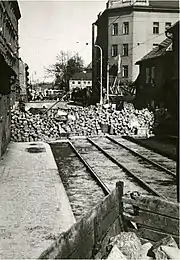 Late in the evening on 5 May, the radio broadcast an appeal to the people in the streets of Prague to build barricades in order to slow the anticipated German attack. Despite poor weather, tens of thousands of civilians worked overnight to construct over 1,600 barricades by morning.[71] A total of 2,049 were constructed by the end of the uprising.[72]