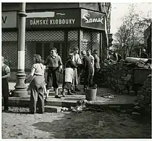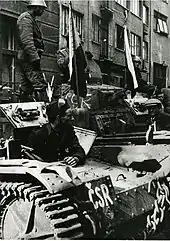 Around noon, the radio broadcast a series of appeals to the police and gendarmerie requesting aid in fighting SS guards inside the radio building.[58] A detachment of Government Army policemen responded to the call, and met stiff resistance as they retook the building.[59][60] During the entire time, the radio continued to broadcast.[61] Although not directed at the populace, the appeal ignited fighting all over the city, concentrated in the downtown districts.[62] Crowds of unarmed civilians, mostly young men with no military training, overwhelmed German garrisons and stores.[5] Many casualties were inflicted by German soldiers and civilians sniping from strong-points or rooftops; in response, Czech forces began to intern Germans and suspected collaborators.[56] Czech noncombatants assisted by setting up makeshift hospitals for the wounded and bringing food, water, and other necessities to the barricades, while German forces were often resorted to looting to obtain essential supplies.[63] Czech forces seized thousands of firearms, hundreds of Panzerfausts, and five armoured vehicles, but still suffered a shortage of weapons.[64]