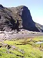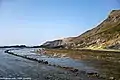 A secluded beach which is unspoiled and never busy and visitors to the beach must negotiate a marked pathway and steps which lead down to this beach from a car park on the cliff above. The beach has many interesting and unusual rock formations. The beach is popular for sports such as Kite surfing, Windsurfing, and bodyboard surfing. The sea here is designate with a Flag#Swimming flags is considered too dangerous for swimming.