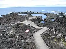The coastline, with about 9.2 km (5.7 mi), is generally low and very jagged, with islets and points that alternate with sheltered coves, especially the Areia Bay (Baía da Areia) and the Canas Bay (Baía de Canas). The small port and above all the “natural pools” attract many holidaymakers, especially Poça Branca, where there are excellent conditions for bathing. The beach of Canto da Areia, with black volcanic sands, is the only beach on Pico Island. The small watercourses, with shallow valleys, originate in the Achada Plateau and flow in a torrential regime. South of the parish, numerous lagoons (Lagoa do Caiado, Lagoa Seca) are home to various bird and plant species and have a significant environmental interest.[4]