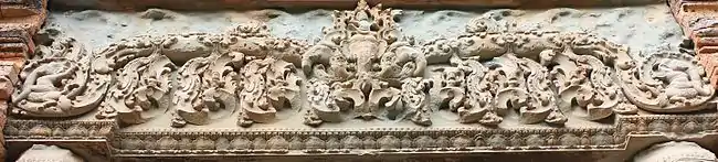 This temple is one of the first temples constructed of durable material such as bricks and laterite and with decoration in sandstone. A brick enclosure originally surrounded the pyramid with a stone gopura on the east side is now almost completely disappeared. Much of the stucco on the surface of the temple has vanished. The main sandstone lintel is decorated with a fine carving of Indra standing on his three-headed elephant Airavata. Garlands emanate from either side of Indra in the style current to the monument. There is an inscription on either side of the small doorway which detail the dedication and praises the early Khmer kings from Jayavarman II onward as well as earlier legendary kings, including the ancestor of the nation, the hermit Kambu.[4]