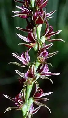 The heathland leek orchid grows in heath, although not in swampy places. It used to occur south from Sydney but is now only known from three locations near Jervis Bay.[2][3]