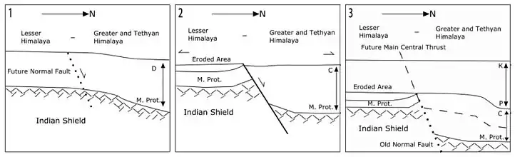 This model illustrates that in Carboniferous, due to possible rifting,[4] the Lesser and Greater Himalaya were separated by a north-dipping normal fault. In this reconstruction, the former is the footwall and the latter is the hanging wall.