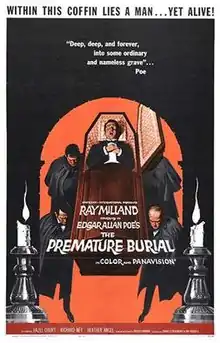 The Premature Burial, also known as Premature Burial, is a 1962 American horror film directed by Roger Corman and starring Ray Milland, Hazel Court, Alan Napier, Heather Angel and Richard Ney. The screenplay by Charles Beaumont and Ray Russell is based upon the 1844 short story of the same name by Edgar Allan Poe. It was the third in the series of eight Poe-themed pictures, known informally as the "Poe Cycle", directed by Corman for American International Pictures.[3]