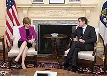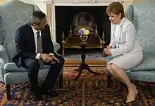 The same day of taking office, she was appointed to the Privy Council of the United Kingdom and therefore granted the style 'The Right Honourable'.[18] On 21 November, she unveiled her Cabinet with a 50/50 gender balance, promoting Finance Secretary John Swinney to become her deputy first minister.[19]