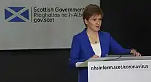 Sturgeon announced to the Scottish Parliament on 18 March that all schools and nurseries in Scotland would close on 20 March to try and limit the spread of the virus.[76] On 23 March, Sturgeon issued a statement, placing Scotland on a "lockdown", limiting the reasons as to why people may leave their homes in an increase attempt to limit the spread of the virus, to protect the health of the population, as well as to ease the pressure the virus places on NHS Scotland services and workforce.[77] Since then restrictions have been frequently tightened, loosened and adapted in parts or all of Scotland to respond to developments in the situation.[78]