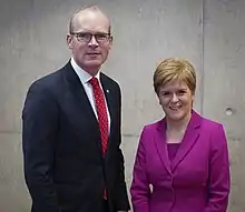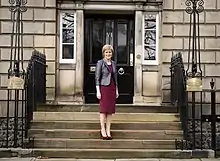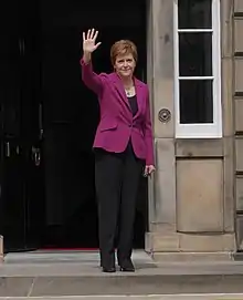 Sturgeon's leadership as SNP leader was first tested by the 2015 UK general election, to which she led her party to a historic landslide victory. The SNP won all, but three, of the fifty-nine seats in Scotland, the best result of the SNP since the 1974 general election.[1] She then led her party through the 2016 Scottish Parliament election.[2] Although the SNP lost their overall majority, Sturgeon still secured her position as first minister through as minority government. The following month a referendum on the UK's membership in the EU was put to the people. The result concluded with England and Wales voting a majority to leave, with Scotland and Northern Ireland voting overwhelmingly to remain.[3] She commented, stating is was "democratically unacceptable" that Scotland could be taken out of the EU "against its will".[4] Sturgeon, ever since, has been pushing for a second independence referendum. In the 2017 UK general election, the SNP saw a fall in seats but in the 2019 election, regained many winning 48 seats.[5][6] Sturgeon led the SNP to a fourth consecutive win, securing a third term in the Scottish Parliament, in the 2021 election.