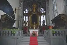 The word presbyterium is the Latinised form of the Greek πρεσβυτέριον ( presbuterion), "council of elders, presbytery",[1] from Greek πρεσβύτερος (presbuteros), the comparative form of πρέσβυς (presbus), "elder".[2]