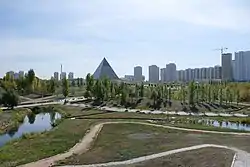 The Presidential Park (Kazakh: Президенттік саябақ, Prezidenttık saiabaq) is one of the largest urban parks in Nur-Sultan. Built in 2008 at the 10th anniversary of the Capital City Day, it is located right behind the Ak Orda Presidential Palace and across the Ishim river. It is the site of the Palace of Peace and Reconciliation with flower beds and trees occupying most of the territory. From the north side the park is bordered by Baitursynov Street and from the south by Najimedenov Street.[1] The park is surrounded by multi-story residential buildings and it's artificial stream with fountains is shaped as the Simurgh, a bird symbol of Kazakhstan's independence.[2]