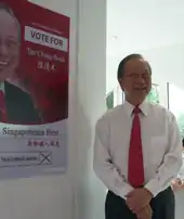 Singapore law does not prevent political parties, the Government, or non-governmental bodies with close government ties from endorsing candidates. The first presidential election in Singapore in 1993 pitted Ong Teng Cheong, a former PAP Member of Parliament who had been Deputy Prime Minister and Chairman of the National Trades Union Congress (NTUC), against the former Accountant-General, Chua Kim Yeow.[45] Chua showed initial reluctance, accepting the nomination only as his "national duty"[46] and even proclaiming Ong to be the far superior candidate.[47] He declined to campaign, saying he could not afford it.[48] However, he did address the populace via two ten-minute broadcasts offered by state-owned television and radio stations.[49] His appeal was based on preventing an over-concentration of powers – he asked Singaporeans whether they wanted the PAP to dominate the Presidency as well.[50] In contrast, Ong invested $50,000 to $60,000 of his own money in the campaign. He was assisted by the NTUC which mobilized its 230,000 members to canvass at least five votes each for their former union boss.[51] Ong was backed by Prime Minister Goh Chok Tong who appealed to Singaporeans to vote for him. On polling day, 28 August 1993, Ong received 952,513 votes (58.7%) and Chua 670,358 votes (41.3%) out of a total of 1,756,517 votes.[52] Ong was thus declared the first Elected President of Singapore. Ironically, Ong himself said that his links to the PAP might have cost him a few percentage points in votes.[53] Given the strong show of government support for Ong, commentators expressed the view that Ong's victory meant a victory for the PAP and the continuation of its values and style of governance. Although the votes for Ong fell short of the PAP's expected 60–70% range, the result was not seen as a repudiation of the PAP[54] but as indicative of Singaporeans' appetite for stronger checks and balances.[55]