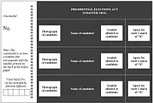 A person who satisfies the eligibility requirements set out in the Constitution is entitled to be nominated as a presidential candidate.[130] Between 11:00 a.m. and 12:00 noon on nomination day, he or she must submit a nomination paper to the returning officer. Among other things, the nomination paper must contain a statutory declaration that the person is qualified to be elected, that he or she is not a member of a political party, and that the person understands the President's constitutional role in the following terms:[131]