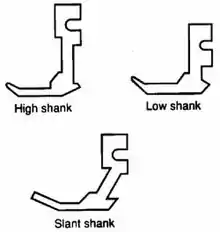 Different manufacturers have produced machines with one of three types of presser foot shank in mind. These are the low shank, high shank, and the slant shank presser foot. A low shank presser foot has a 0.5 inches (13 mm) distance from the bottom of the foot to the center of the thumbscrew; a high shank foot has a 1 inch (25 mm) distance; a slant shank foot is distinctly slanted. The kind of foot a given machine requires is not interchangeable: a low-shank machine will only accept a low shank presser foot, and a high shank machine only a high-shank presser foot, though within these categories any low shank or high shank foot will fit any corresponding low shank or high shank machine; exceptionally, a slant shank foot can only be used with a Singer slant needle machine and no other (likewise, such a machine can accept no other kind of foot).