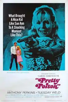 Pretty Poison is a 1968 American black comedy film[2] directed by Noel Black, starring Anthony Perkins and Tuesday Weld, about an ex-convict and high school cheerleader who commit a series of crimes. The film was based on the novel She Let Him Continue by Stephen Geller. It has become a cult film.[3]