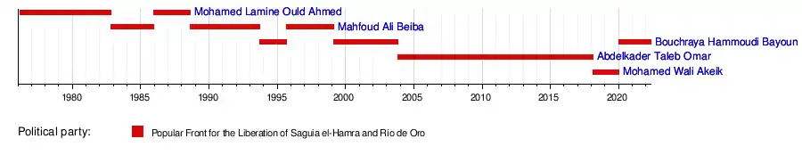 | (1) | Mohamed Lamine Ould Ahmed (born 1947) | 18 December 1985 | 16 August 1988 | 2 years, 242 days | POLISARIO | — | |