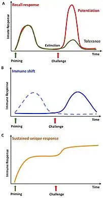 Immune priming is memory-like phenomenon described in invertebrate taxa of animals. It is evolutionarily advantageous for an organism to develop a better and faster secondary immune response to pathogen, which is harmful and which it is likely to be exposed again. In vertebrates immune memory is based on adaptive immune cells called B and T lymphocytes, which provide an enhanced and faster immune response, when challenged with the same pathogen for a second time. It was assumed that invertebrates do not have memory-like immune functions, because of their lack of adaptive immunity. But in recent years evidence supporting innate memory-like functions were found. In invertebrate immunology the common model organisms are different species of insect. The experiments focusing on immune priming are based on exposing the insect to dead or sublethal dose of bacteria or microbes to elicit the initial innate immune response. Afterwards the researchers compare subsequent infections in primed and non-primed individuals to see if they mount a stronger or modified response.[5]