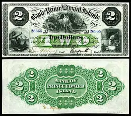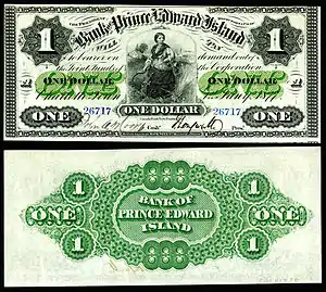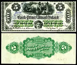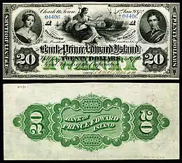 The Prince Edward Island Treasury issued British pound notes (1848–58) in 5 and 10 shilling, and 1, 2, and 5-pound denominations.[1] The Merchant Bank of Prince Edward Island issued banknotes (1871–91) in 1, 2, 5, 10, and 20 dollar denominations[2] (and prepared a proof for a 5 dollar 1900 issue, but it never circulated).[3]
