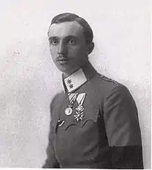 Prince René of Bourbon-Parma was the nineteenth child among the twenty four children of the last reigning Duke of Parma, Robert I (1848–1907). Prince Rene's mother was Duke Robert's second wife, Princess Maria Antonia, a daughter of the exiled King Miguel I of Portugal. By his father's first and second marriages, Rene had seventeen siblings who survived childhood. Two of the most famous included Empress Zita of Austria and Prince Felix, the consort of Charlotte, Grand Duchess of Luxembourg. Prince Rene was born in Schwarzau am Steinfeld.[1] He was raised in Austria.[2] Educated at the Theresianum in Vienna, he graduated from a military academy and served at the Imperial and Royal armed forces as a cavalry officer.