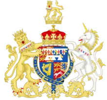 William was granted use of his father's arms (being the arms of the kingdom, differenced by a label argent of five points, the centre bearing a fleur-de-lys azure, the other points each bearing a cross gules), the whole differenced by a label argent (or azure).[12]