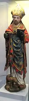 The coat of arms granted to the town of Stavelot, in 1819, is also that of the abbey—parted fesswise between an image of St Remaclus and the wolf, which in Stavelot's founding legend carried bricks for the building of the abbey after having killed Remaclus's donkey.[9][31][48]