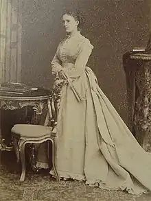Princess Eugenia of Leuchtenberg was born on 1 April [O.S. 20 March] 1845 at the Mariinskiy Palace in Saint Petersburg.[3][4] She was the fourth child and third daughter of Maximilian de Beauharnais, 3rd Duke of Leuchtenberg and his wife Grand Duchess Maria Nikolaevna of Russia. Eugenia's father, Maximilian, Duke of Leuchtenberg, had traveled to St. Petersburg, eventually winning the hand of Grand Duchess Maria Nikolaevna, Nicholas I's eldest daughter. Maximilian was subsequently bestowed with the style Imperial Highness and given the title Prince Romanowsky.[5] As the daughter of a Russian grand duchess and an ennobled Russian prince, Eugenia and her siblings were always treated as grand dukes and duchesses, bearing the styles Imperial Highness.[6][7][8]