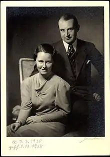 Sophie became entangled in the small diplomatic scandal as preparations for the Dutch wedding commenced. The German Nazi government, apparently outraged that their flag was not used in festivities related to the wedding, refused to release the passports of Sophie, along with those of Bernard's cousins Princesses Sieglinde and Elizabeth zur Lippe.[3][4][5] The German government stated that they were also protesting supposed anti-Nazi incidents in the Netherlands, and was angry that Juliana's German fiancé Prince Bernhard had not publicly defended the Nazi regime there.[4][5] Wilhelmina and the Dutch government responded that because they believed the wedding to be a private, family affair, the use of the German flag would be inappropriate; they instead opted to fly the Dutch national flag alongside the flag of Bernhard's family.[3][6] German displeasure also applied to their national anthem; Wilhelmina and the Dutch government saw no need in playing it at the wedding, as Bernhard was now a Dutch citizen, and thus no longer held German citizenship.[6] A note of protest was sent to Berlin, declaring that the withholding of the necessary documents was "an insult to the Queen".[3] Though the Dutch minister to Berlin apologized for one of the incidents concerning the Nazi flag (in which it was taken from a German school in the Hague), the Nazi government regarded his statement as "insufficient".[4][5] The passports were not released until Prince Bernhard sent a personal letter to German Chancellor Adolf Hitler.[3]
