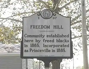 Princeville is a town in Edgecombe County, North Carolina, United States, and is the oldest town incorporated by African Americans in the United States. It was established by freed slaves after the Civil War and incorporated in 1885. It is part of the Rocky Mount, North Carolina Metropolitan Statistical Area. As of the 2010 census, the town population was 2,082. A 2018 special census recount placed the town's population at 1,939 residents.[5] The town is on the opposite bank of the Tar River from Tarboro. The city of Rocky Mount is 16 miles (26 km) to the west.