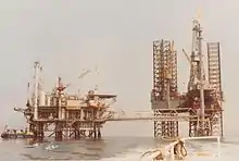 ![]() The Prinos D production platform with the Penrod 58 jackup rig on location for workover in 1982 | |
