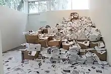 In 2013, Kenneth Goldsmith called for people to send pages printed from the internet to the art gallery, LABOR, located in Mexico City. Ten tons of paper submitted 20,000 contributors filled at 1,100 square meter room, and after the exhibition the paper was recycled.[1] 250,000 pages of JSTOR articles were submitted in Printing out the Internet exhibit in honor of Aaron Swartz, an internet activist that pushed to have more information made public on the Internet, specifically information from the legal system. These unpurchased materials were worth $353,229.00, which posed issues of the exhibit's legality.[2]