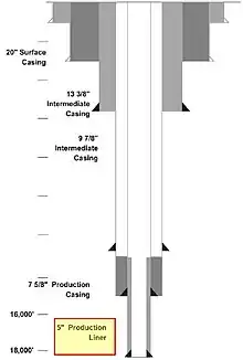 A production liner is a string of casing set across a production interval but does not extend all the way back the surface. Usually there is about a 500 ft (more or less) overlap between a liner and the casing string above. The production liner has the same function as a complete string of production casing. A typical casing arrangement in a well is shown in the diagram below. In this case, the surface casing is set to a depth of about 3000 ft. Two intermediate strings are set in this well — a 13 ⅜" string and a 9 ⅞" string. A 7 ⅝" production casing is set at a depth of about 15,000 ft and a 5" production liner set to TD. Probably, this well required a high mud weight at the bottom of the hole and cementing the 7 ⅝" casing at TD would have resulted in too much pressure and lost circulation. If lost circulation occurs during a primary cement job, there is little guarantee that cement will fill the designated volume behind the casing. This will require the casing be perforated and cement squeezed into the casing/well bore annulus.