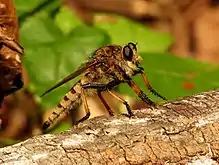 Promachus rufipes, known generally as the red-footed cannibalfly or bee panther, is a species of robber flies (insects in the family Asilidae).[1][2][3][4]