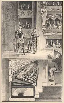 Nowadays, many of the earlier duties of the prompter are undertaken by the stage manager, who will have a copy of the script called the prompt book.[2] This is the most definitive version of the script for any one performance, and will contain details of all cues, with their precise timings with respect to the action on stage.[3] This allows the prompt to direct lighting, sound, flying effects and scene changes during a show. The prompt book also often contains blocking notes, so that the prompt is always aware of the intended positions and movements of all the actors on stage at any given time.