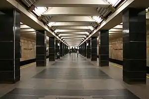 Prospekt Veteranov is a shallow column station lying in a depth of 8 metres (26 ft). The underground hall was constructed as a project of the architect V. G. Khiltchenko and the engineer S. P. Schukin. Memorial style corresponds the name of the station.