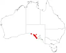 West coast mintbush is only known from the Eyre Peninsula in South Australia where it usually grows on limestone outcrops in mallee vegetation.[5]