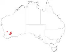 This mintbush grows in rocky places and on sandplains and has been collected in the Avon Wheatbelt, Coolgardie and Mallee biogeographic regions.[2][3]