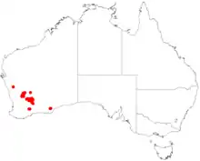 This mintbush grows between granite rocks in the Avon Wheatbelt, Coolgardie and Mallee biogeographic regions of Western Australia.[2][3]