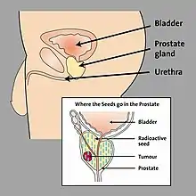 LDR prostate brachytherapy (seed or line source implantation) is a proven treatment for low to high risk localized prostate cancer (when the cancer is contained within the prostate).[4][5] Under a general anaesthetic, the radioactive seeds are injected through fine needles directly into the prostate, so that the radiotherapy can destroy the cancer cells. The seeds are permanently implanted. They remain in place but gradually become inactive as the radioactivity decays naturally and safely over time.[6] Unlike traditional surgery, LDR brachytherapy requires no incisions and is normally carried out as an outpatient (day case) procedure. Sometimes a single overnight stay in hospital is required. Patients usually recover quickly from LDR brachytherapy. Most men can return to work or normal daily activities within a few days. LDR brachytherapy has fewer side-effects with less risk of incontinence or impotence than other treatment options.[7] It is a popular alternative to major surgery (conventional radical prostatectomy or laparoscopic (keyhole surgery) radical prostatectomy).
