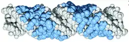 The exact secondary and tertiary structure of protamine is not known with certainty, but several proposals have been published since the 1970s.[22][23][1][24][25][20][26] The broad consensus is that protamine forms beta strand structures that then crosslink through disulphide bonds (and potentially dityrosine and cysteine-tyrosine bonds).[25][20] When protamine P1 binds to DNA, cysteine from the amino terminal of one protamine P1 forms disulfide bonds with the cysteine from the carboxy-terminal of another protamine P1. By neutralizing the backbone charge protamine enables the DNA to more tightly coil.[3][26] The disulfide bonds function to prevent the dissociation of protamine P1 from DNA until the bonds are reduced when the sperm enters the egg.[1] These long protamine polymers may then wrap around the DNA within the major groove.[1][23]
