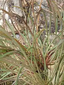 It has linear to oblanceolate leaves,[7][12] indistinctly veined and ending in a sharp mucronate point, which grow up to 1.75–3 inches (4.4–7.6 cm) in length, and 1.6 to 3.7mm in width. The base of the leaves attenuates gradually to the broadest point. The leaves are adpressly hairy, soon becoming glabrous.[7]